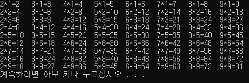 1. 출력 첫 줄이 2*1 ~ 9*1까지기 때문에 안쪽 반복문 y를 먼저 써주는 것이 특징.