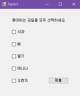 CheckBox를 끌어와 Text를 사과,배,딸기,바나나,오렌지 총 5개를 만들어보자