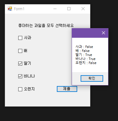 다음과 같이 CheckBox를 이용하여 좋아하는 과일을 골라서 저장후 출력해보자.