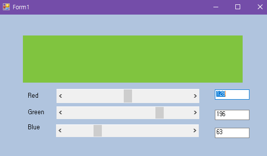 이 코드블럭은 각각의 색상이 0이 아니라는 조건 하에 참이 되고. 텍스트박스에 입력된 값을 int.Parse를 통해 scrR,G,B.Value에 전달하게 된다. 이 값을 Color.FromArgb함수를 통해 패널에 색상이 조합되어 화면에 표현된다.
