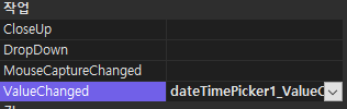 DateTimePicker도구를 폼으로 끌어와 DateTimePicker의 이벤트를 상단의 그림처럼 ValueChanged의 값을 바꾸어준다.