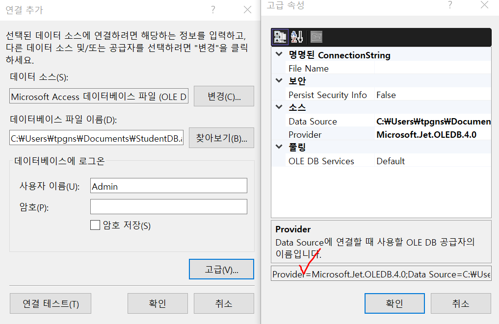 visual stdio에서 도구 - 데이터베이스에 연결 하면 위의 창과 같이 뜨는데 찾아보기로 DB파일 연결해주고, 고급을 누르면 Provider에 체크표시와 같이 뜨게 된다. 이는 나중에 DB에 접근할때 사용해야하니 복사해두도록하자.