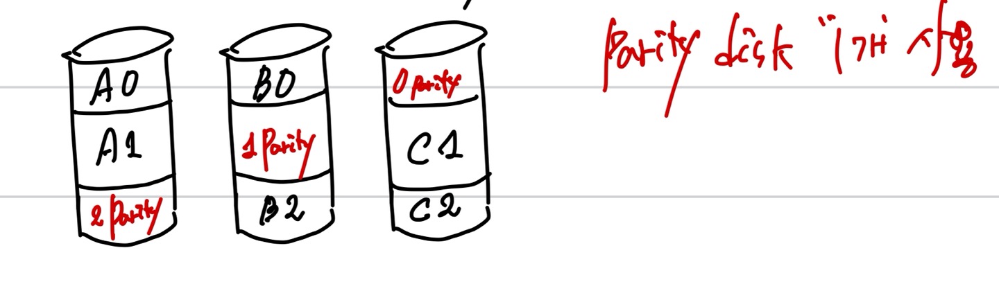 RAID - 5 : 스트라이핑을 사용하지않고 각각의 디스크에 패리티만 적용