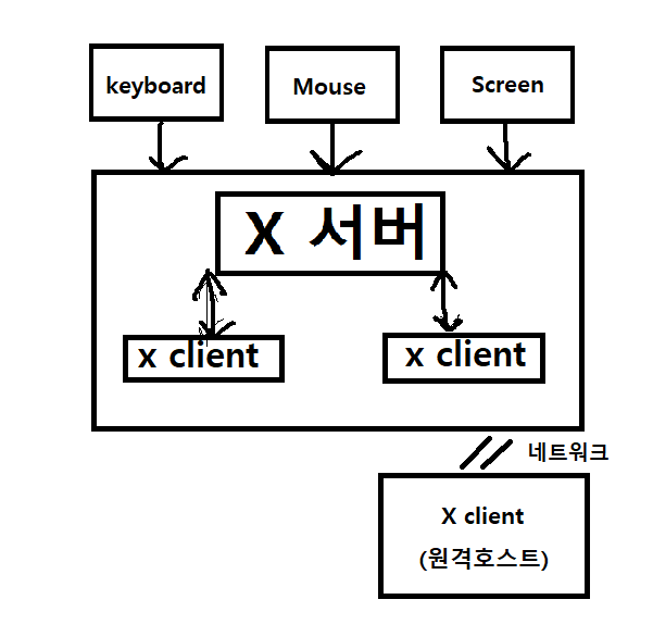 구조를 위 그림과 같다. X서버는 그래픽하게 보여주는 하나의 시스템, X 클라이언트는 X 서버위에 동작하는 일종의 응용프로그램을 말한다. X윈도는 네트워크를 기반으로 동작하기 때문에 키보드,마우스가 TCP포트 6000번을 통해 전달되고, 관련 X클라이언트 프로그램이 실행된다.