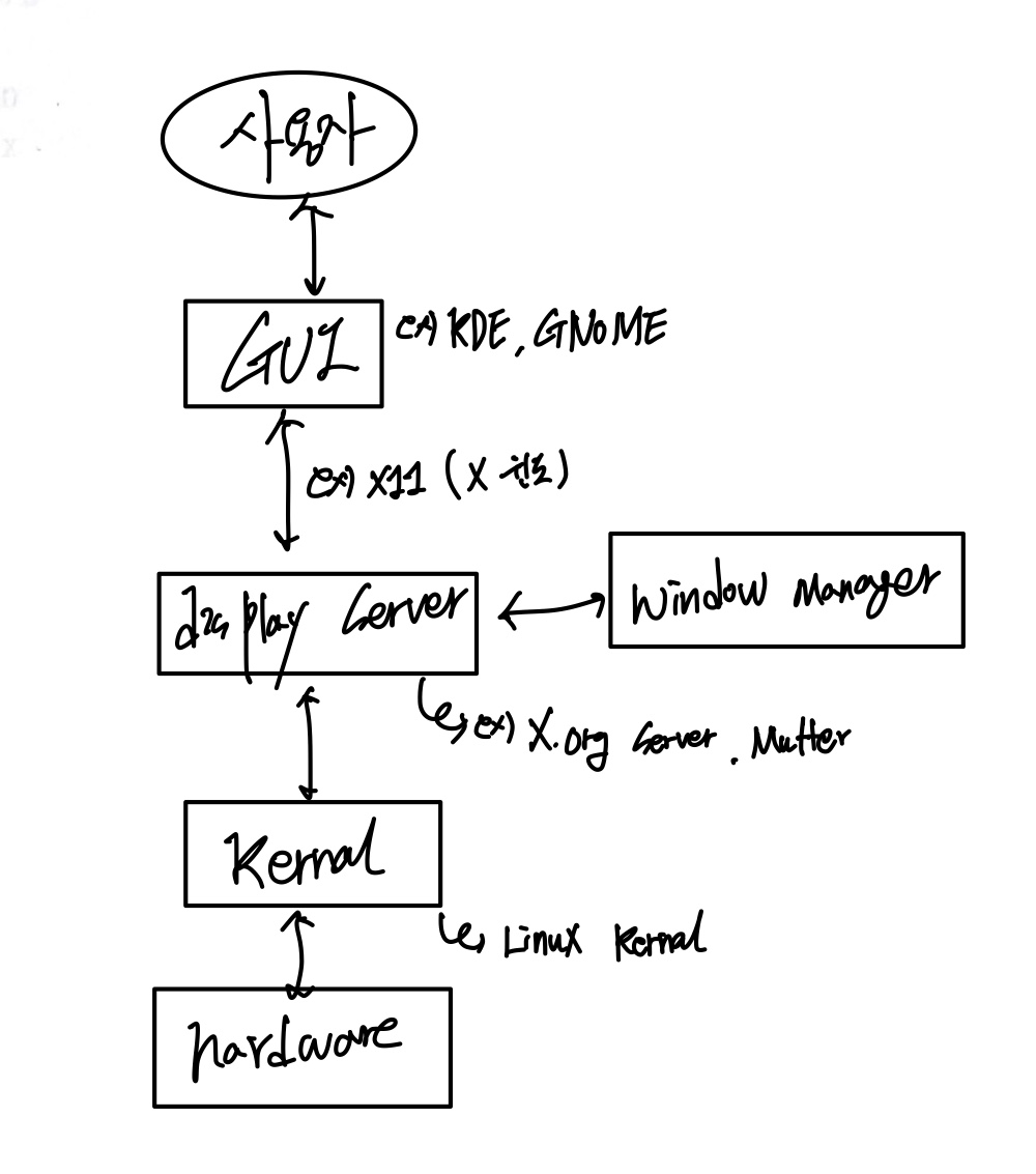 데스크탑 환경? X윈도를 포함하여 통칭함. DOS창이 아닌 Window OS처럼 바탕화면이 있고 아이콘이 있는 것.