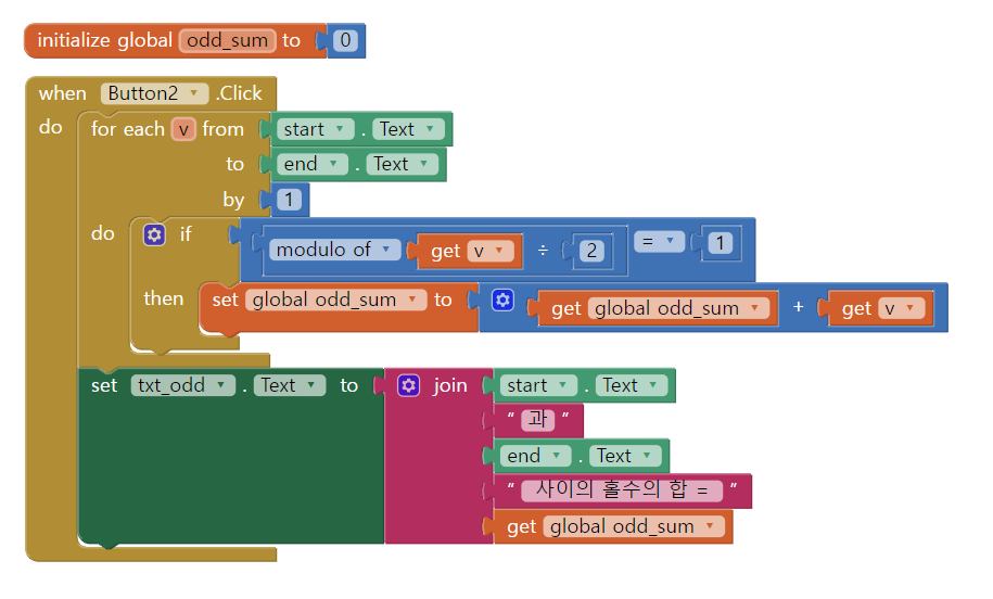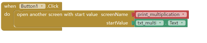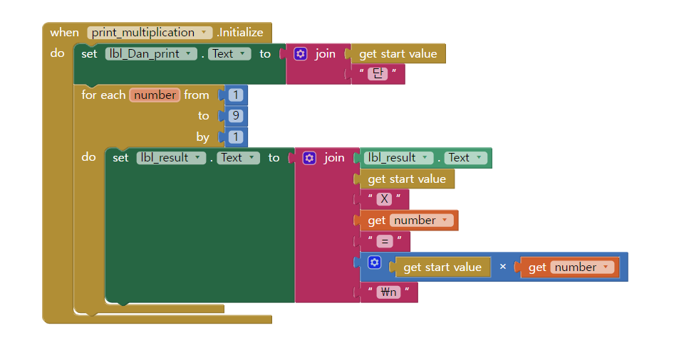 설명하면, Screen1에서 버튼이 눌렸을때 lbl_Dan_print 의 text값이 시작값으로 초기화되며 1~9까지 순회하면 시작값과 곱해진다.