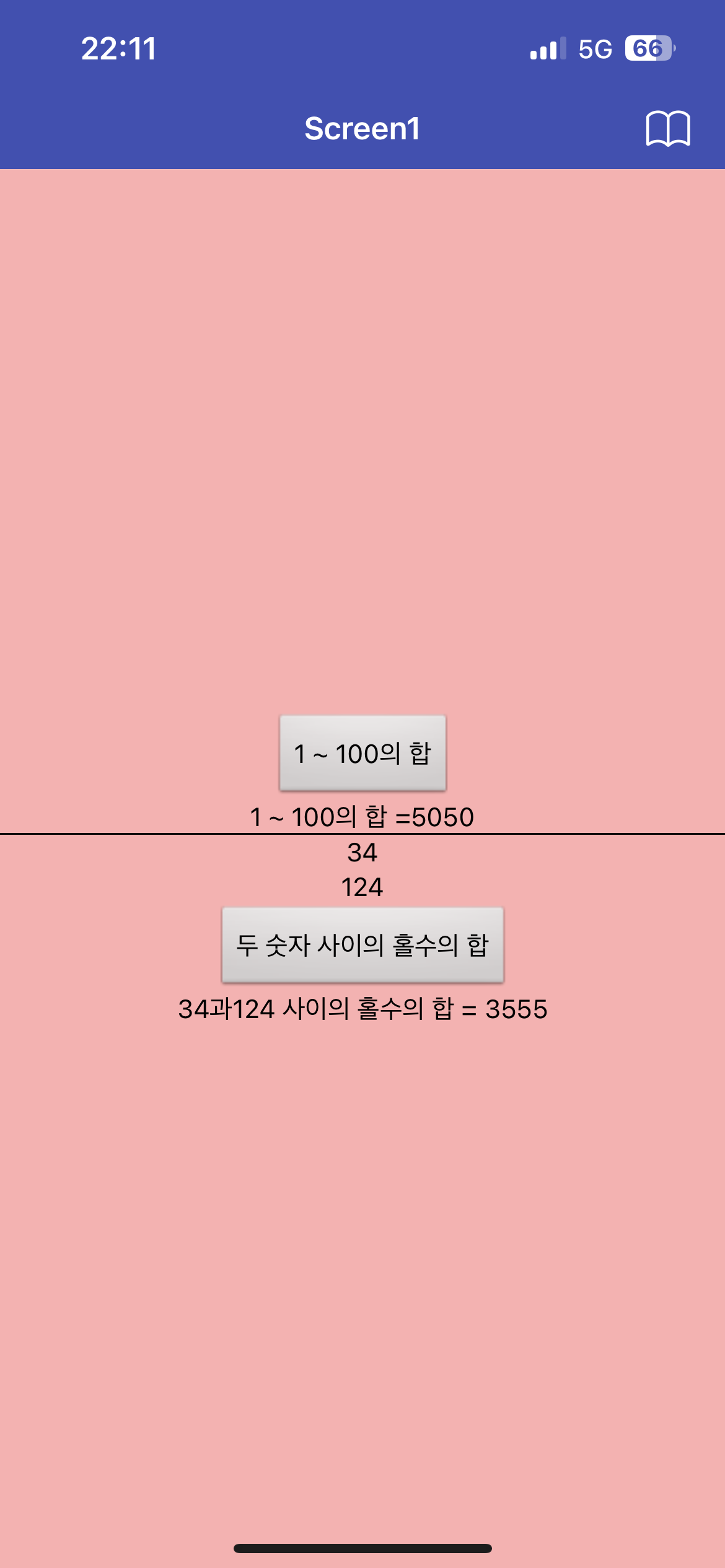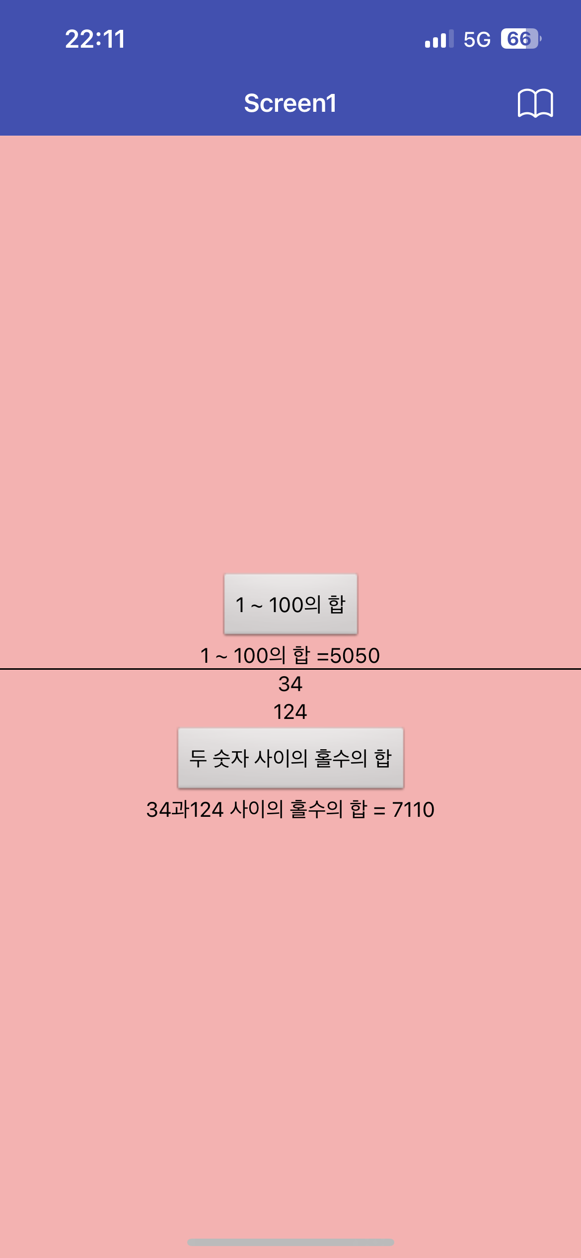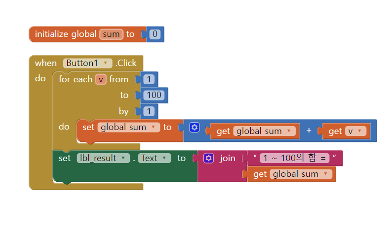 button1을 눌렀을때, 반복분을 통해 1 ~ 100을 순회할때 sum에 v값을 계속 추가한다. 100번 루프가 돌게되면 값을 출력한다.