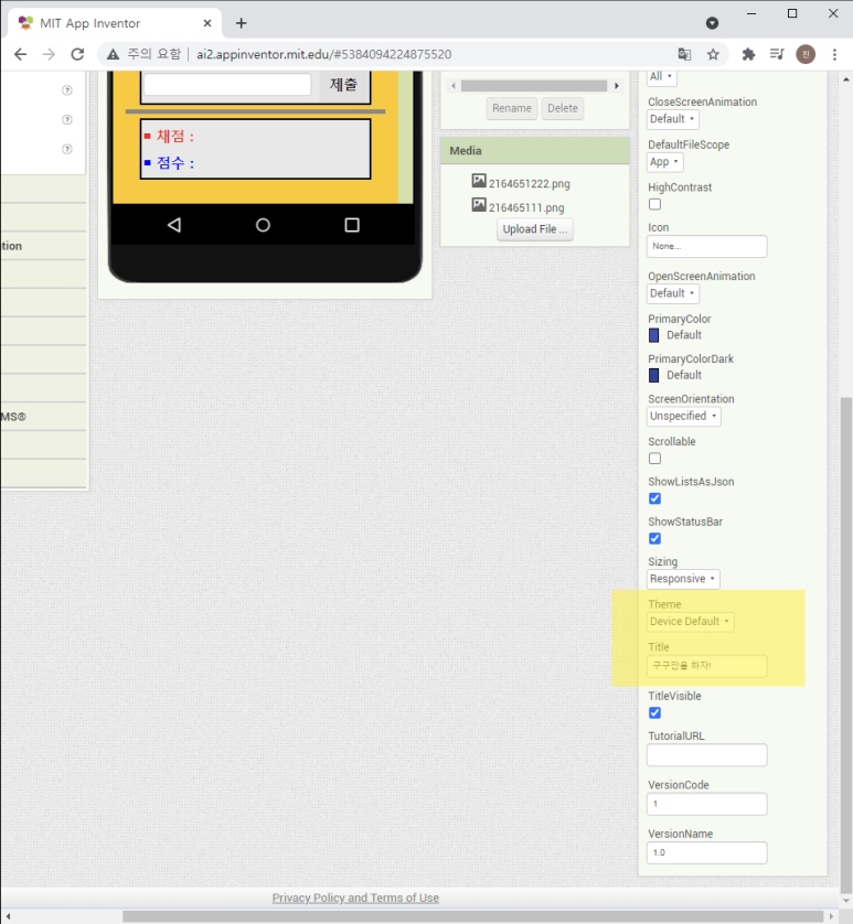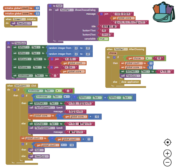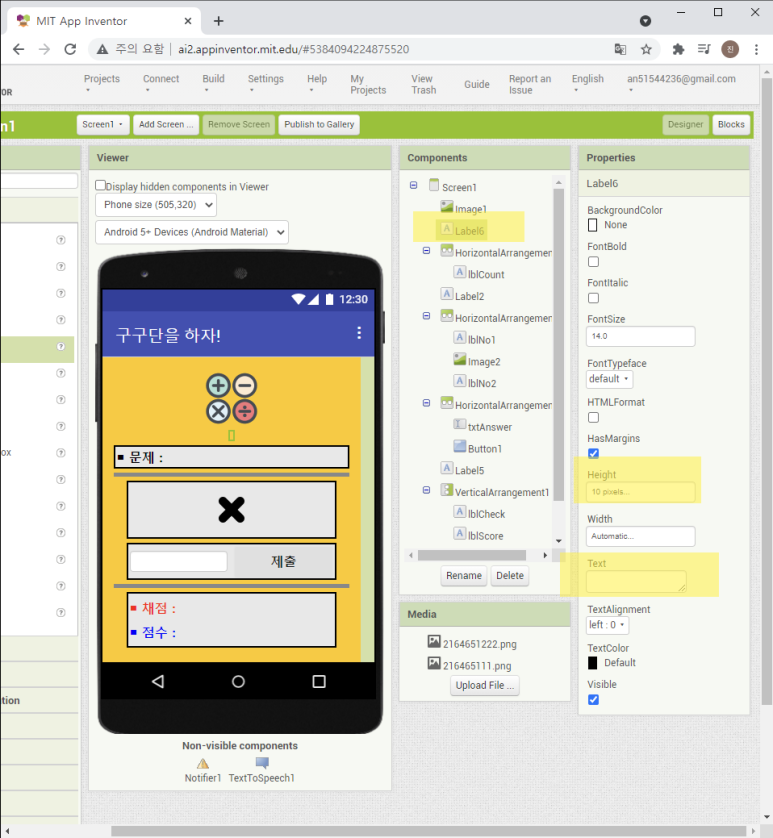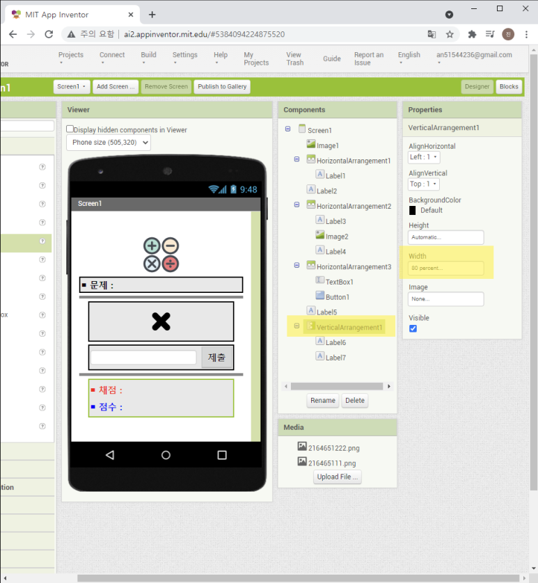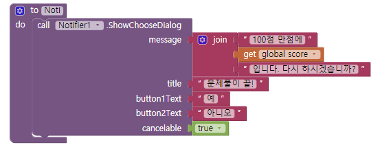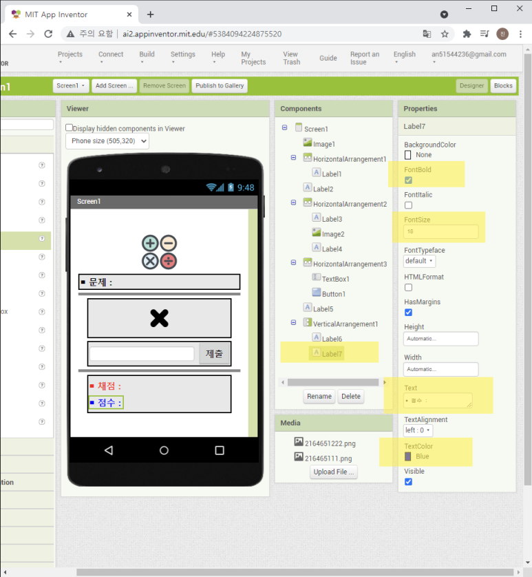 ●VerticalArrangement(수직정렬 레이아웃)에 담은 Label6,7 : 채점과 점수 표시