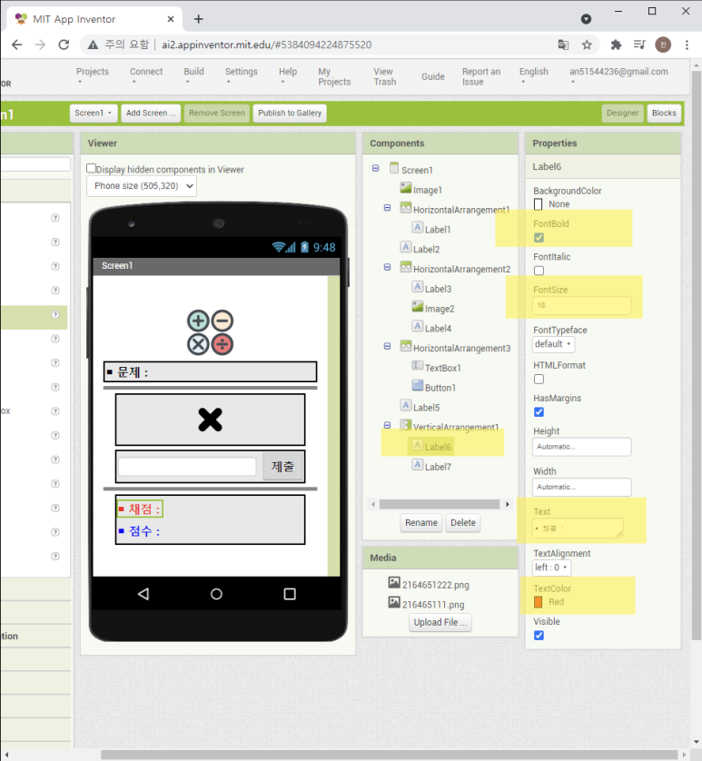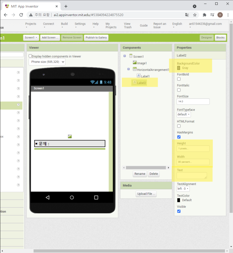 HorizontalArrangement(수평정렬 레이아웃)에 담은 Label 디자인