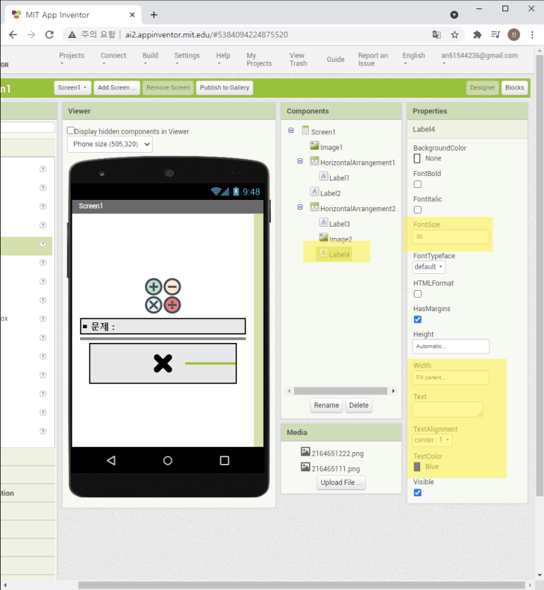 3-6) HorizontalArrangement(수평정렬 레이아웃)에 담은 Label3,4와 이미지 디자인