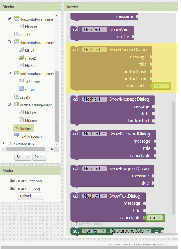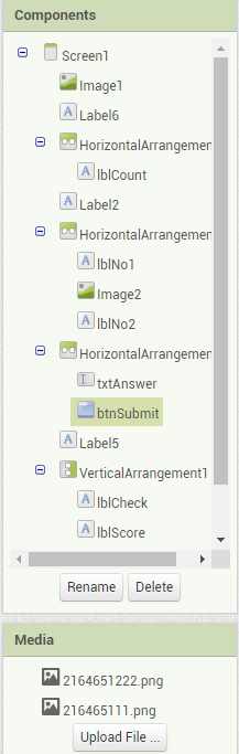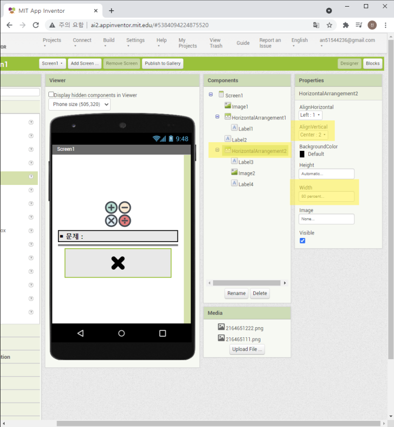 ● HorizontalArrangement(수평정렬 레이아웃)에 담은 Label 2개와 image 1개 : 문제 표시