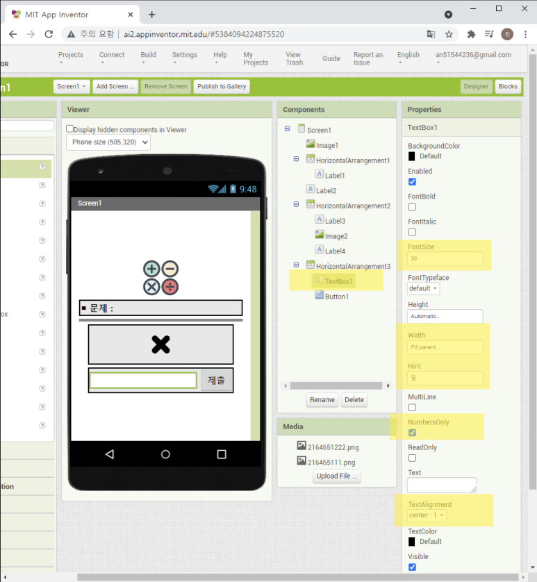 3-7) HorizontalArrangement(수평정렬 레이아웃)에 담은 Textbox와 Button 디자인
