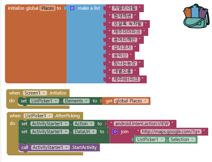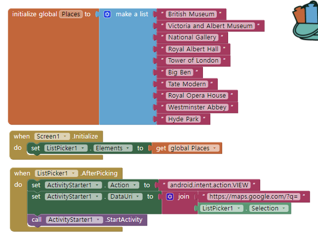 -Screen1이 실행될 때 ListPicker에 Places 리스트를 가져온다.