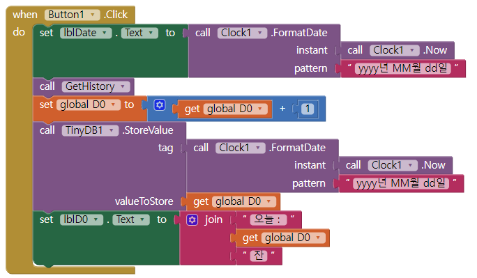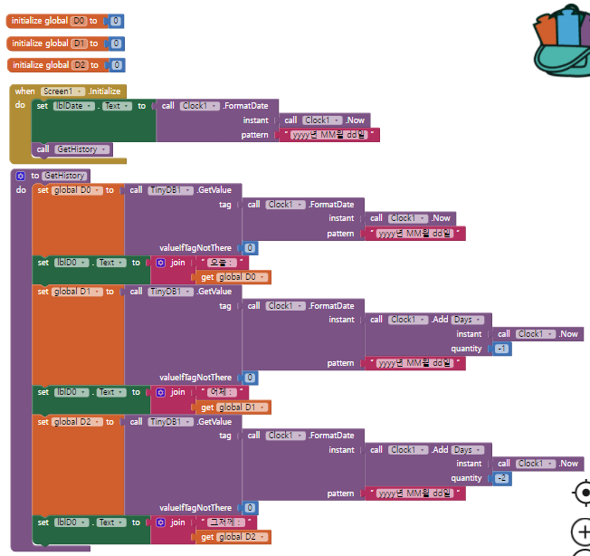 - 스크린1이 시작되면 날짜를 시간을 불러와 yyyy년 MM월 dd일로 나타나게 하기, History를 불러오기