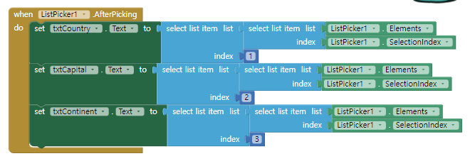 txtContinent의 Text를 ListPicker의 Element중에서 선택된 것의 세번째 index로 하기